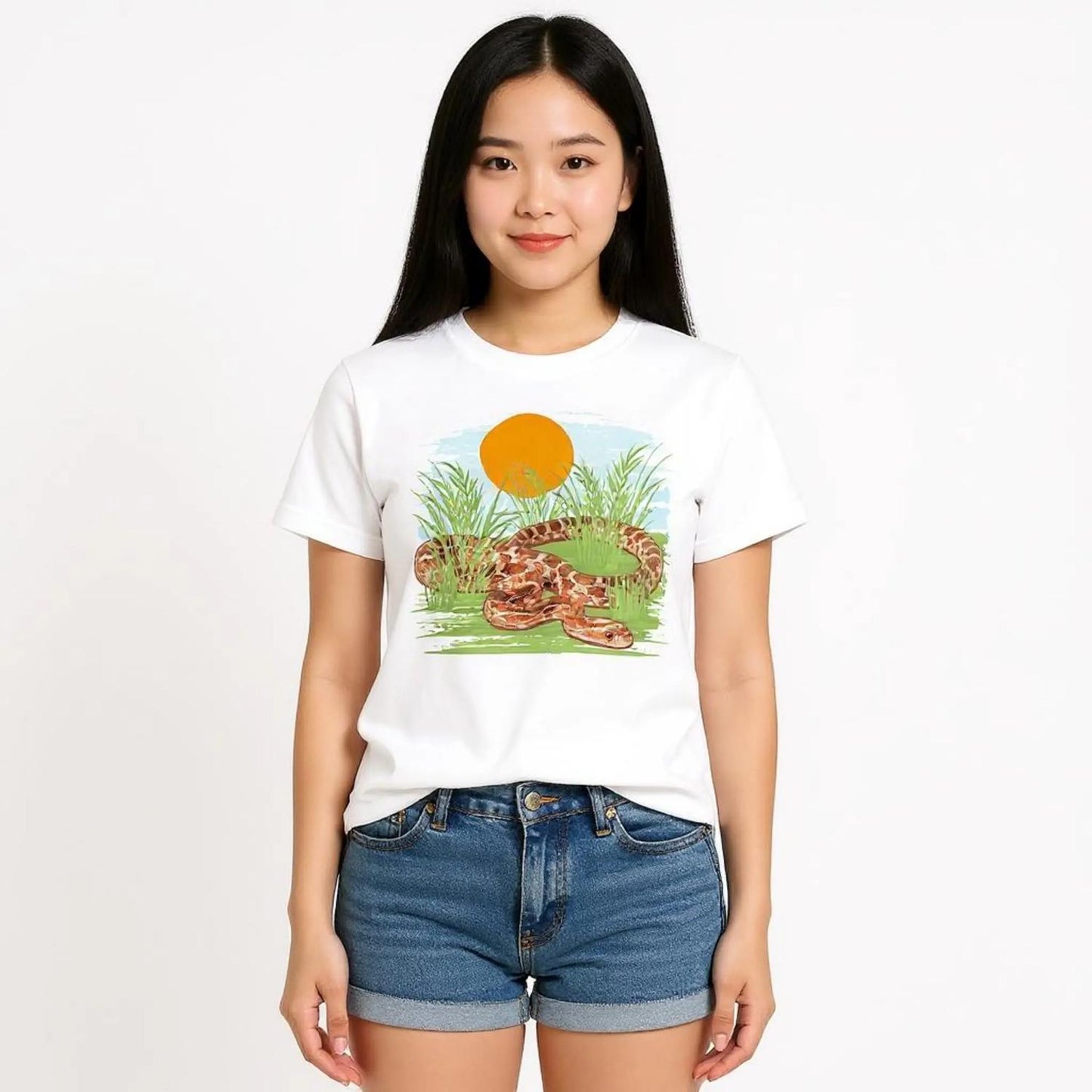 Showcase your love for wildlife with our Corn Snake in Long Grass T-Shirt, featuring a unique rough painted design that captures the essence of nature.
